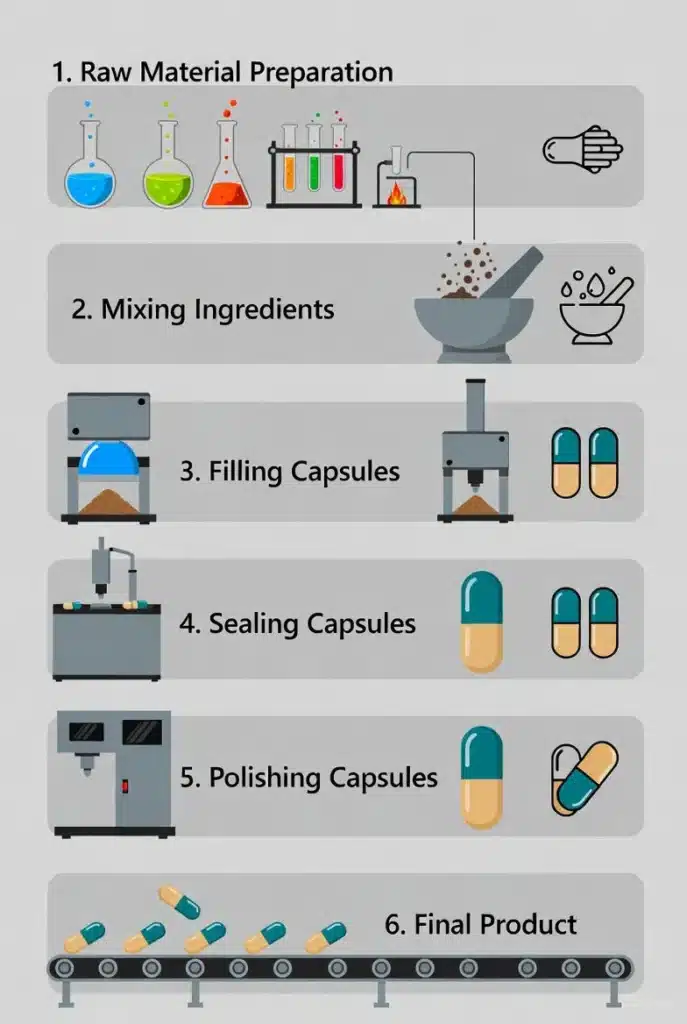캡슐 제조 공정에는 엄격한 GMP(우수 제조 관리 기준) 표준을 준수하여 미리 성형된 쉘에 분말 또는 과립을 채우는 과정이 포함됩니다.